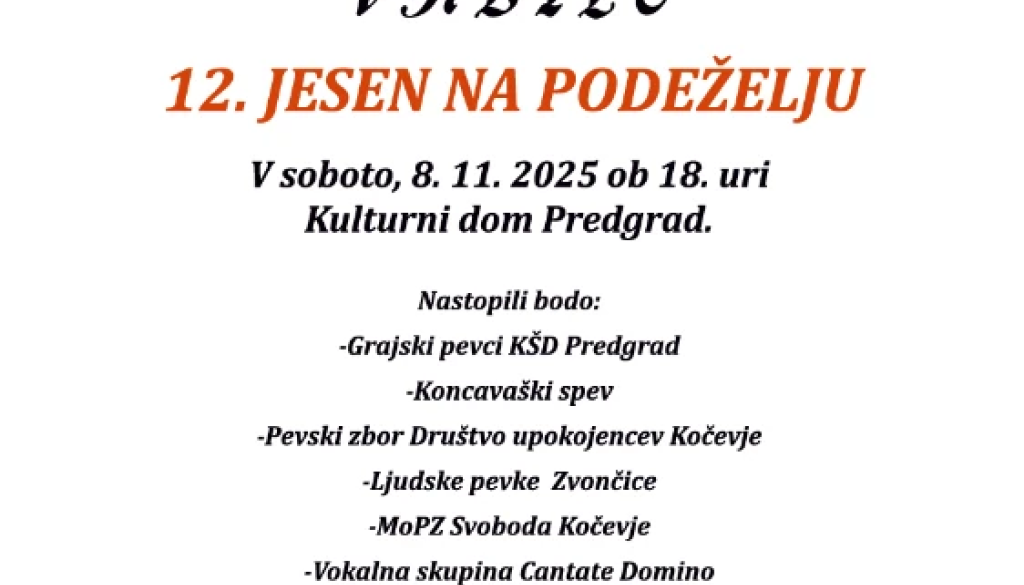 12. Jesen na podeželju gregor1 | 4. november 2025 11:56 v Glasba Termin Sobota, 8. november 2025 18:00 Lokacija Kulturni dom Predgrad 12. Jesen na podeželju