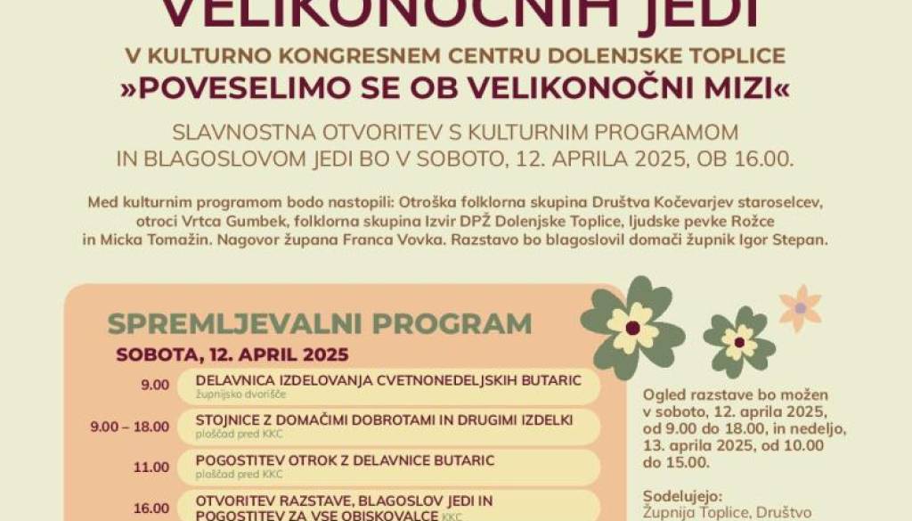 KKC Dolenjske TopliceVabljeni na že 21. razstavo velikonočnih jedi DPŽ Dolenjske Toplice, ki bo letos potekala 12. in 13. marca v KKC Dolenjske Toplice! Pester program tudi letos nagovarja obiskovalce vseh starosti, na ploščadi pred KKC pa se načrtuje še veliko zanimivih aktivnosti, ne zamudite! K prijavi pa še vedno vabimo ekipe za tradicionalno sekanje pirhov.