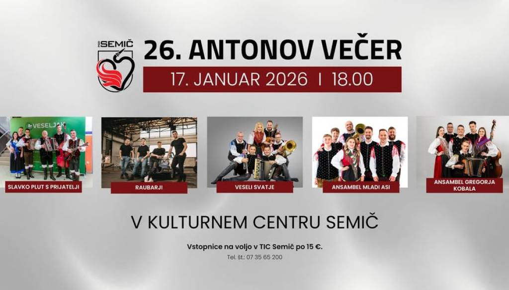 Kulturni center SemičProstovoljno gasilsko društvo Semič vabi na tradicionalni 26. Antonov večer 2026, ki bo v soboto, 17. januarja 2026, ob 18.00, v dvorani Kulturnega doma Semič. 🚒🔥