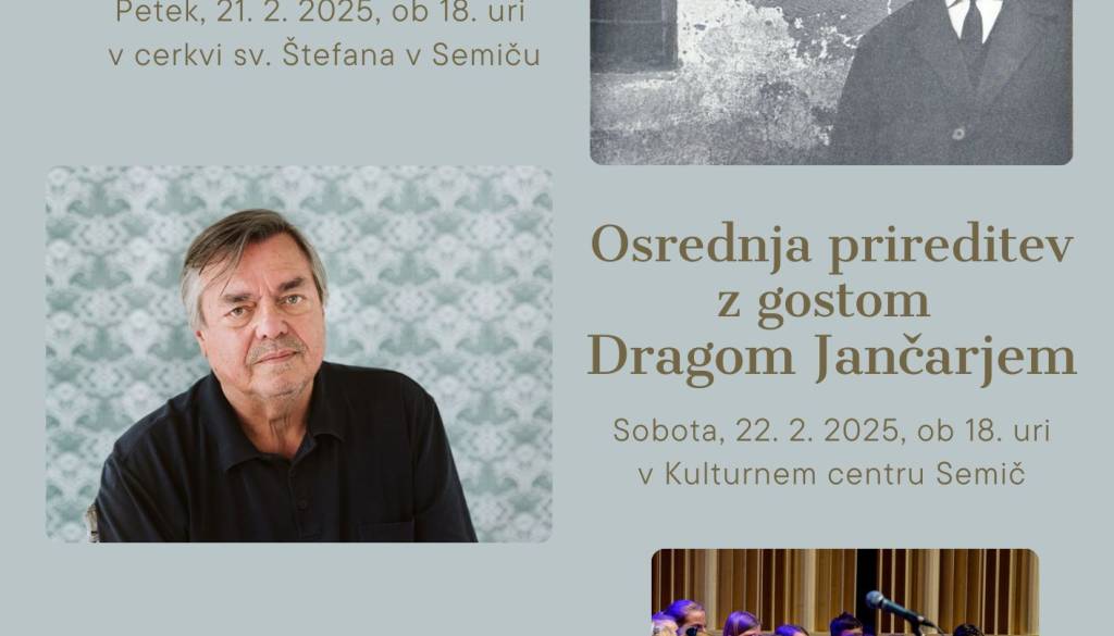 Kulturni center SemičKD Orel Semič, Župnija Semič in Kulturni center Semič vas v sklopu 29. KRAKARJEVIH DNEVOV 2025 vabita na OSREDNJO PRIREDITEV Z GOSTOM DRAGOM JANČARJEM,