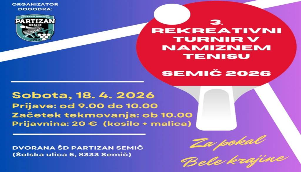 Dvorana ŠD Partizan SemičŠportno društvo Partizan vas vabi na 3. REKREATIVNI TURNIR V NAMIZNEM TENISU ZA POKAL BELE KRAJINE – SEMIČ 2026