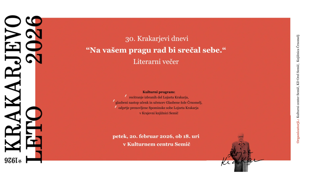Kulturni center SemičKulturni center Semič, KD Orel Semič in Knjižnica Črnomelj vas v sklopu Krakarjevega leta 2026 vabijo na literarni večer z naslovom »Na vašem pragu rad bi srečal sebe.« v petek, 20. februarja, ob 18.00 v Kulturnem centru Semič. Literarni večer je organiziran v sklopu jubilejnih 30. Krakarjevih dnevov, ki bodo leto potekali od 20. do 22. februarja.