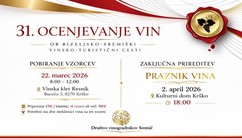 Vsi sodelujoči prejmejo priznanja, najboljši pa tudi praktične nagrade, ki bodo podeljene na prazniku vina, 2. aprila 2026 v Kulturnem domu Krško.