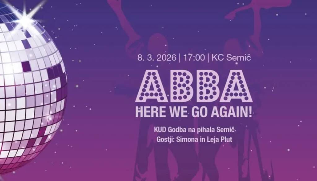 Kulturni center SemičKUD Godba na pihala Semič in Kulturni center Semič vas vabita na ponovitev decembrskega koncert Abba: Here We Go Again! v nedeljo, 8. marca 2026, 17. uri v Kulturni center Semič.