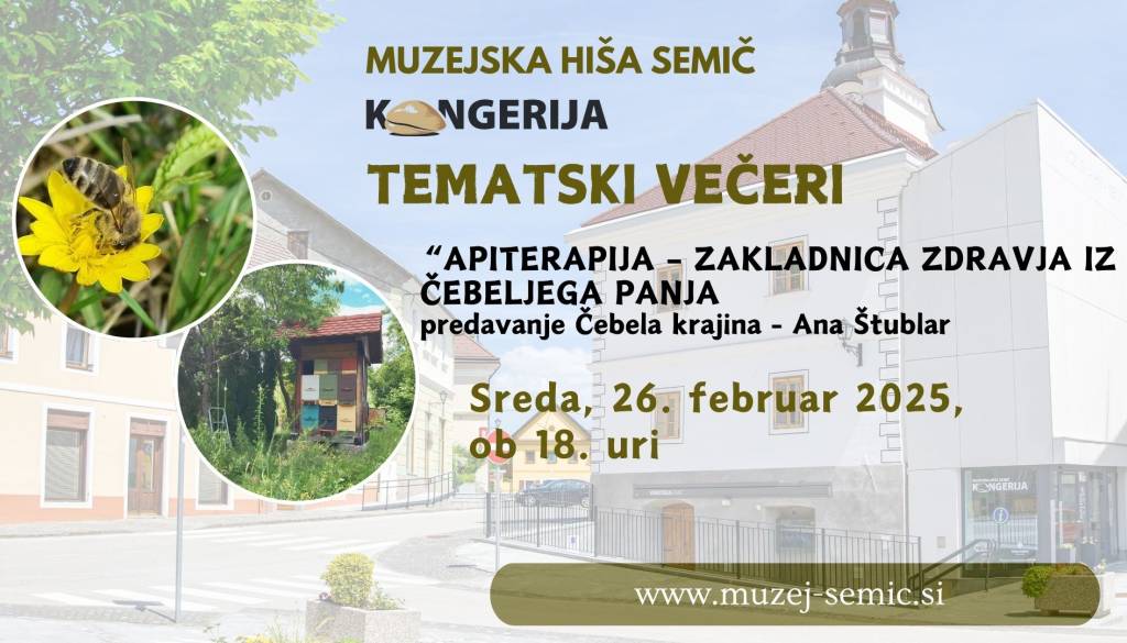 Muzejska hiša SemičMuzejska hiša Semič vas v sklopu TEMATSKIH VEČEROV vabi na predavanje Čebele krajine – Ana Štublar z naslovom “APITERAPIJA – ZAKLADNICA ZDRAVJA IZ ČEBELJEGA PANJA v sredo, 26. februarja, ob 18. uri v Muzejshi hiši Semič.