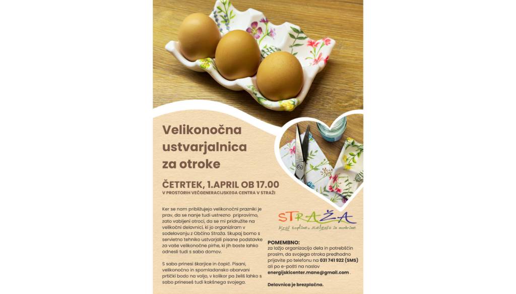 Na žago 5, 8351 StražaV prosotrih Večgeneracijskega centra v Straži se bo odvila velikonočna ustvarjalna delavnica za otroke, kjer boste izdelali podstavke za pirhe. Delavnico bo vodila domačinka Nataša Prah.