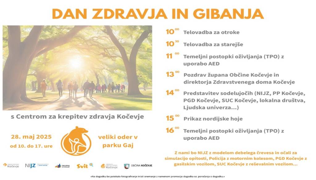 Veliki oder v parku Gaj, 1330 KočevjeZdravstveni dom Kočevje vas v sodelovanju s Centrom za krepitev zdravja vabi na obeležitev Dneva zdravja in gibanja, ki bo potekal 28. maja 2025 od 10. do 17. ure na velikem odru v parku Gaj. V primeru slabega vremena bo dogodek prestavljen v Športno dvorano Kočevje.