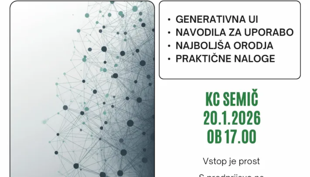 Kulturni center SemičKulturno-umetniško društvo Jože Mihelčič Semič vas vabi na delavnico Generativna umetna inteligenca – izkušnje in novosti v torek, 20. januarja, ob 17.00 v Kulturnem centru Semič. Na delavnici bomo predstavili trenutno najbolj uporabna orodja generativne UI (GenUI) in pokazali, kako jih smiselno vključiti v vsakdanje delo. Delavnica bo praktično naravnana: s kratkimi primeri in vodenimi vajami bomo preizkusili pripravo učinkovitih navodil, tipične delovne tokove ter dobre prakse za odgovorno rabo.