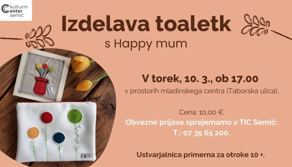 Kulturni center SemičKulturni center Semič vas vabi na ustvarjalnico “IZDELAVA TOALETK S HAPPY MUM” v torek, 10. marca 2026, ob 17.00 v Mladinski sobi (Taborska ulica 8, Semič).