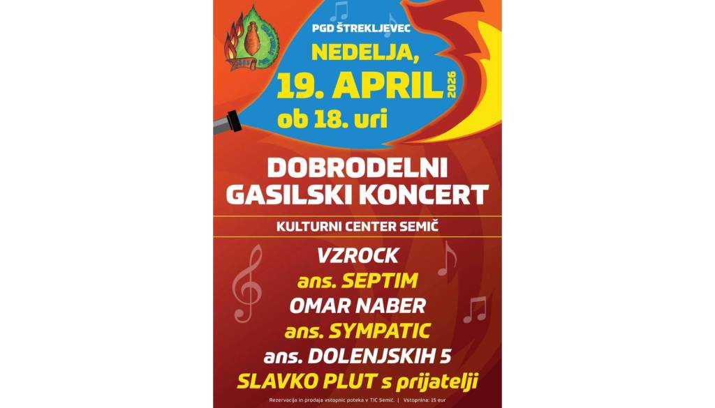 Kulturni center SemičPGD Štrekljevec vabi na DOBRODELNI KONCERT v nedeljo, 19. 4. 2026, ob 18. uri v Kulturni center Semič.