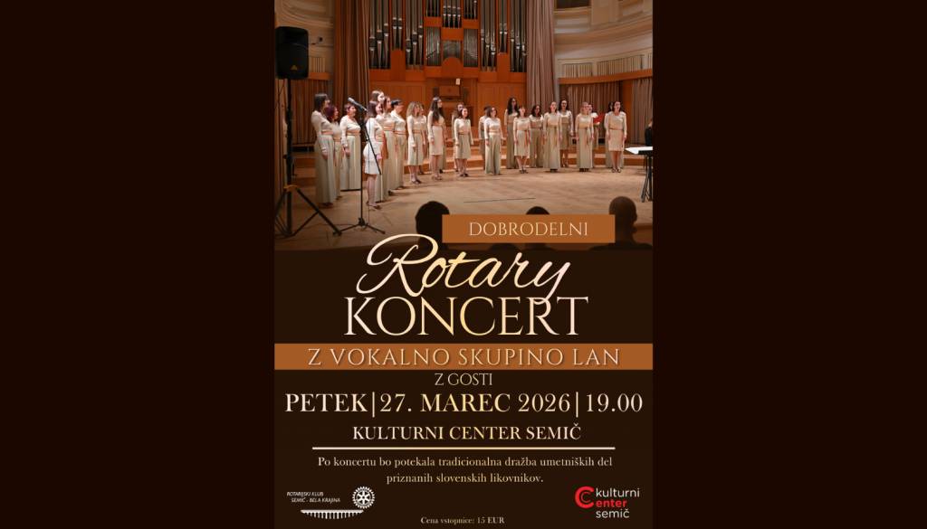 Kulturni center SemičVljudno vabljeni v petek, 27. 3. 2026, ob 19. uri v Kulturni center Semič na večer glasbe Z VOKALNO SKUPINO LAN Z GOSTI. Na tokratni tradicionalni dobrodelni prireditvi Rotary kluba Semič – Bela krajina se bomo družili ob dobri glasbi, po koncertu pa v avli kulturnega centra ob pogostitvi še na prav tako tradicionalni dražbi likovnih del.