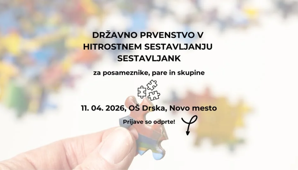 OŠ Drska Novo mestoDržavno prvenstvo v hitrostnem sestavljanju sestavljank bo potekalo v petek, 11. 4 2026, na OŠ Drska v Novem mestu. Tekmovanje bo organizirano v treh kategorijah: posamezniki ob 10. uri, pari ob 12.30 in skupine ob 17. uri.