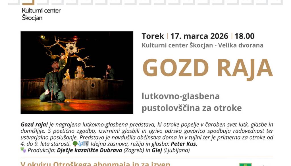 Kulturni center ŠkocjanVabljeni v čarobni gozd, kjer oživijo lutke, glasba in domišljija! Gozd raja! je izjemna lutkovno-glasbena predstava, ki je navdušila občinstva na številnih mednarodnih festivalih ter prejela vrsto nagrad za izvirnost, glasbo, animacijo in likovno podobo. Predstava je bila v sezoni 2025/26 nominirana tudi za prestižno nagrado YAMawards 2025, ki jo podeljuje Svetovna glasbena mladina (Jeunesses Musicales International).