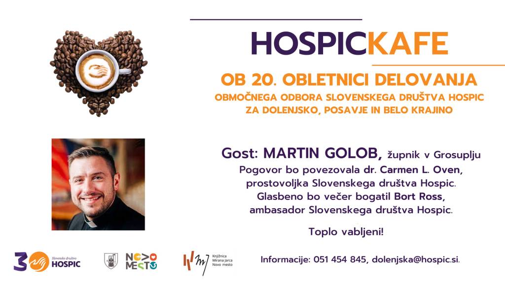 Knjižnica Mirana Jarca Novo mestoOb 20. obletnici slovenskega društva Hospic za Dolenjsko, Posavje in Belo krajino bo gost Hospickafeja eden najbolj priljubljenih duhovnikov pri nas – Martin Golob.