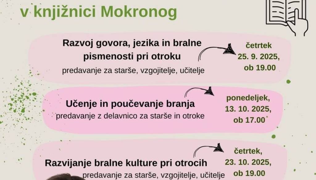 Krajevna knjižnica MokronogV četrtek, 23. 10. 2025, ob 19.00, vabljeni v Krajevno knjižnico Mokronog na tretje predavanje Alenke Stare v sklopu projekta Izberi knjigo namesto telefona z naslovom Razvijanje bralne kulture pri otrocih.
