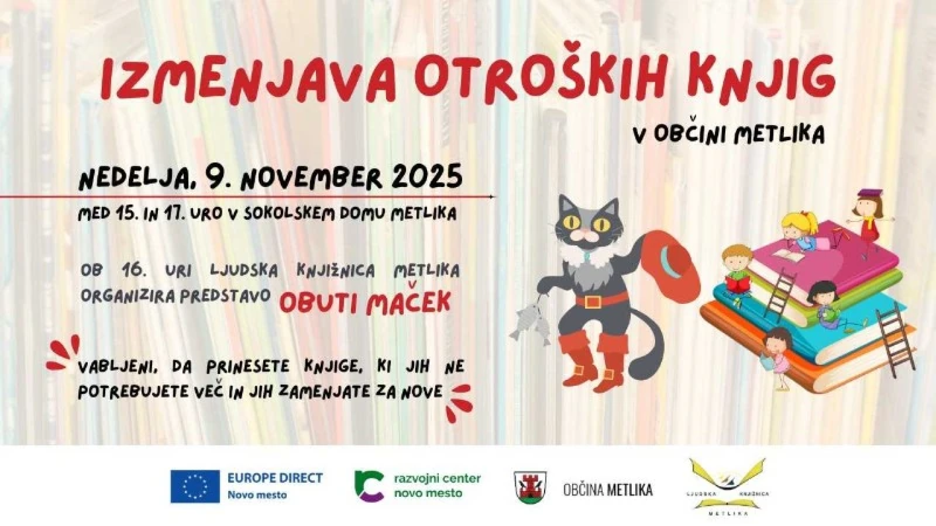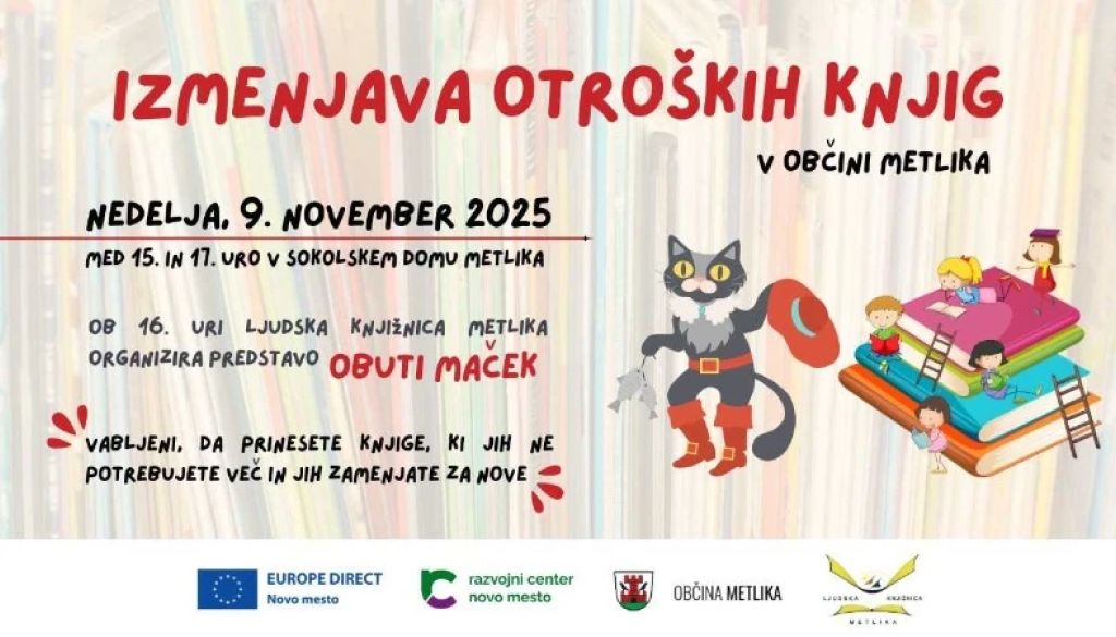 Sokolski dom MetlikaInformacijska točka EUROPE DIRECT Novo mesto v nedeljo, 9. novembra 2025, v Sokolskem domu Metlika pripravlja izmenjavo knjig za otroke.