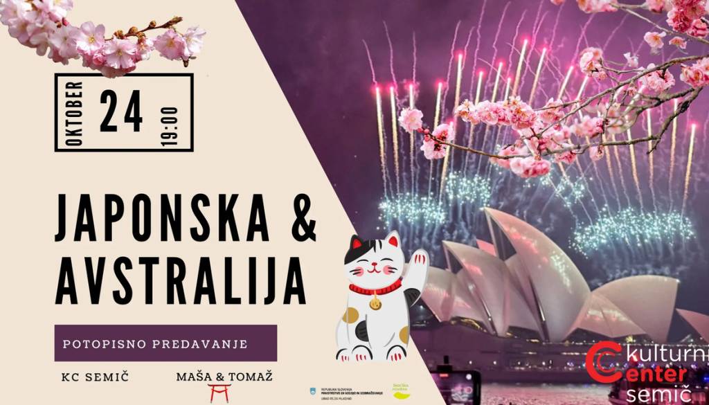 Kulturni center SemičKulturni center Semič vas vabi na potopisno predavanje Maše Petan in Tomaža Starašiniča “JAPONSKA in AVSTRALIJA” v petek, 24. oktobra 2025, ob 19. uri v Kulturnem centru Semič.
