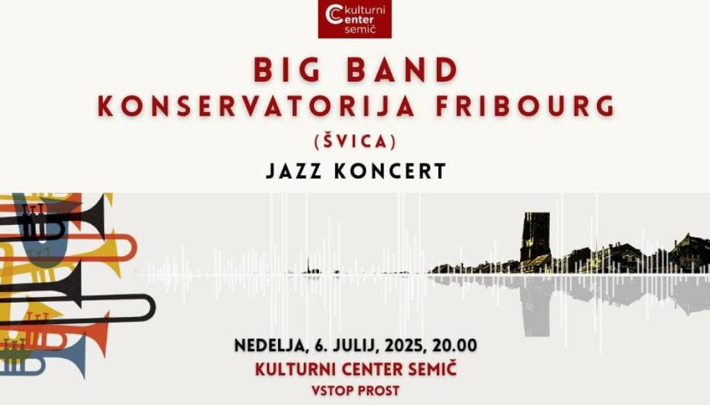 Zelo veseli smo, da bomo v Kulturnem centru Semič v sklopu Poletnih večerov gostili izvrstno Jazzovsko zasedbo BIG BAND KONSERVATORIJA V FRIBOURGU (BBCF) v nedeljo, 6. julija, ob 20. uri. Orkester sestavlja 17 instrumentalistov, ki jih občasno dopolnjujejo vokalisti, redno pa sodeluje s svetovnimi imeni jazza, kot so Jimmy Heath, Clark Terry, Sandy Patton, Marvin Stamm, Phil Woods, Patrick Artero in mnogi drugi.Vsako leto pripravijo svež repertoar, ki vključuje vse od praznične glasbe do instrumentalnega funka