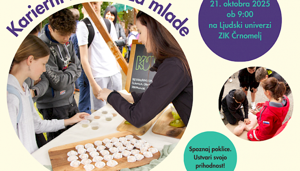 ZIK ČrnomeljZIK Črnomelj vabi na dogodek Karierni navdih za mlade, ki bo v torek, 21. oktobra 2025, od 9. do 12. ure na Ljudski univerzi ZIK.