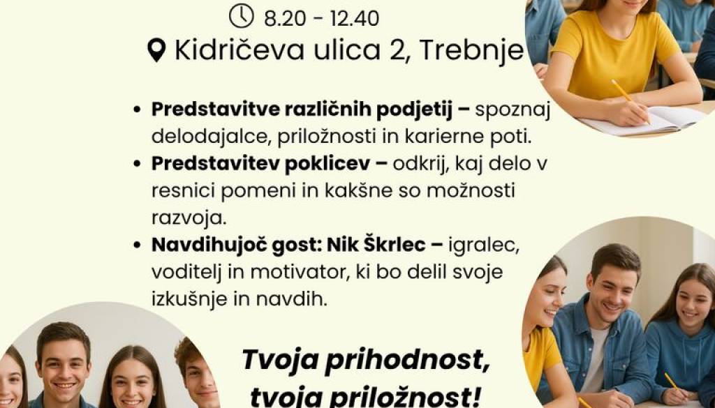 Odgovore na ta vprašanja boš našel na dogodku Karierni navdih za mlade, ki bo potekal v sredo, 19. 11. 2025, med 8.20 in 12.40 na CIK Trebnje, Kidričeva ulica 2, Trebnje.