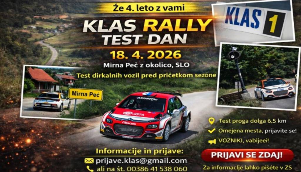 Trg 2, 8216 Mirna PečObveščamo vas, da bo v soboto, 18. 4. 2026, na vašem območju potekal 4. KLAS Rally trening dan – test dirkalnih vozil pred začetkom sezone državnega prvenstva v rallyju.