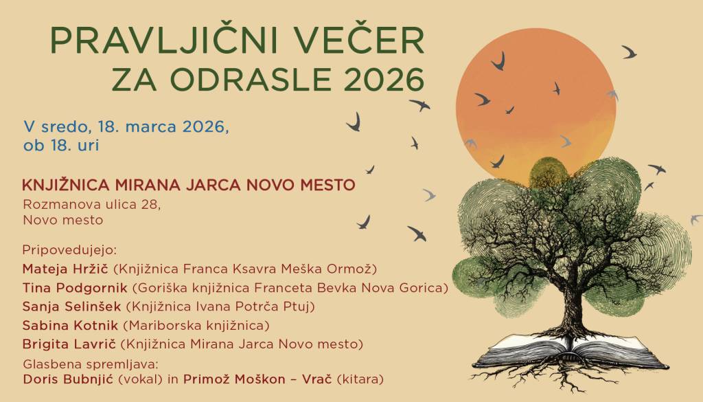 Knjižnica Mirana Jarca Novo mestoLepo vabljeni na pravljični večer za odrasle, na katerem bodo nastopili pravljičarji iz slovenskih knjižnic, z glasbo pa ga bosta začinila Doris Bubnjić (vokal) in Primož Moškon – Vrač (kitara).