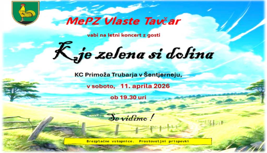 KC Primoža Trubarja ŠentjernejKD MePZ Vlaste Tavčar Šentjernej vljudno vabi na koncert KJE ZELENA SI DOLINA, ki bo v soboto, 11. aprila 2026, ob 19:30 v Kulturnem centru Primoža Trubarja.