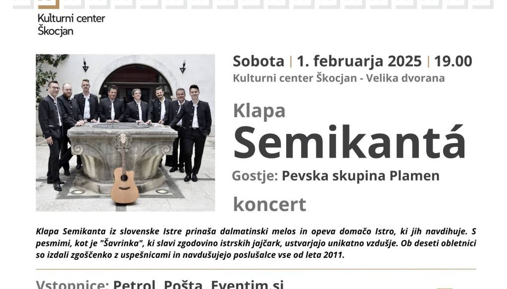 Pridružite se nam na nepozabnem glasbenem večeru, kjer bo Klapa Semikanta s svojim dalmatinskim melosom in istrskim duhom pričarala prav posebno vzdušje! Skupaj z gosti, Žensko pevsko skupino Plamen, nas bodo popeljali v svet dalmatinskih uspešnic, slovenskih priredb in avtorskih pesmi, ki opevajo lepote Istre.