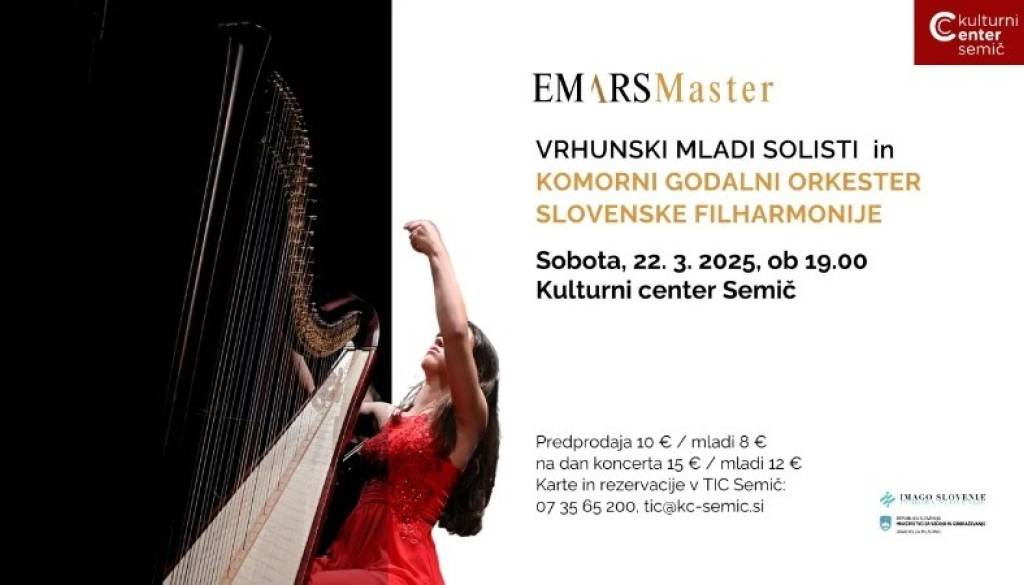 Kulturni center SemičKulturni center Semič vas ob 19. uri vabi na koncert Mladih solistov EMARSMaster in Komornega godalnega orkestra Slovenske filharmonije.