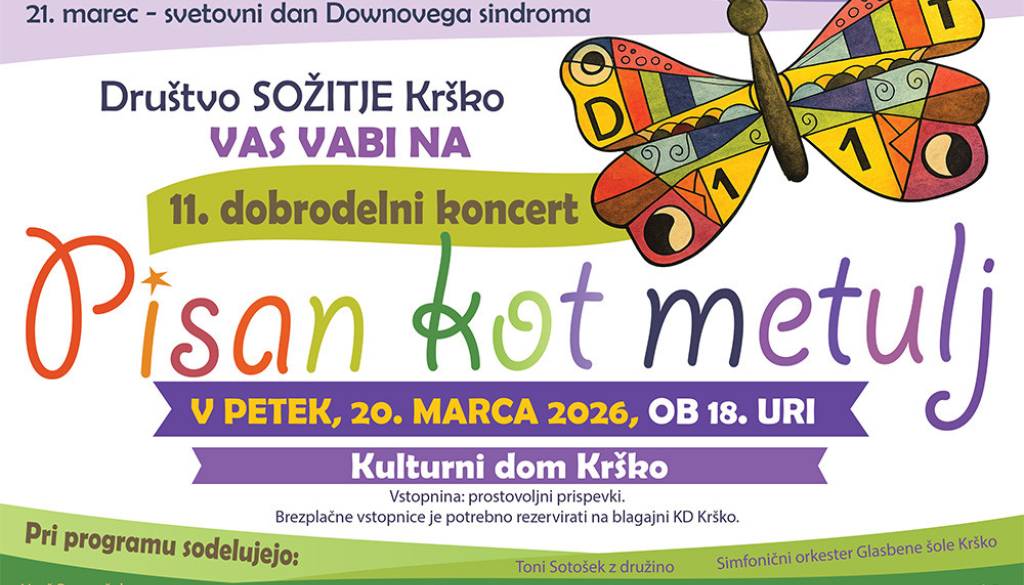 Kulturni dom KrškoDruštvo Sožitje Krško vas ob svetovnem dnevu Downovega sindroma vabi na 11. dobrodelni koncert Pisan kot metulj, v petek, 20. marca 2026, ob 18. uri, v Veliko dvorano Kulturnega doma Krško.