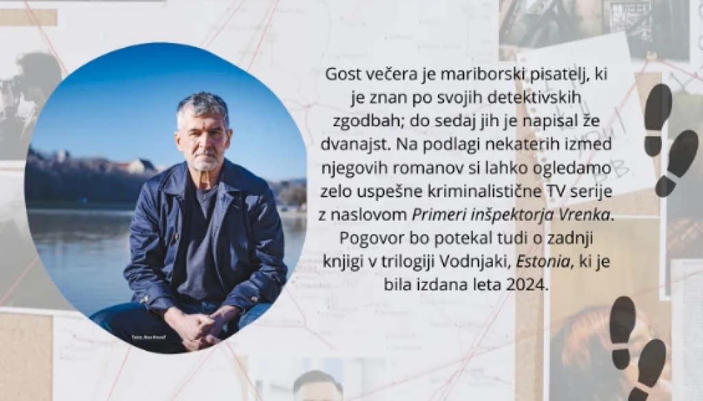 Knjižnica ČrnomeljGost večera je mariborski pisatelj, ki je znan po svojih detektivskih zgodbah; do sedaj jih je napisal že dvanajst. Na podlagi nekaterih izmedmnjegovih romanov si lahko ogledamo zelo uspešne kriminalistične TV serije z naslovom Primeri inšpektorja Vrenka. Pogovor bo potekal tudi o zadnji knjigi v trilogiji Vodnjaki, Estonia, ki je bila izdana leta 2024.