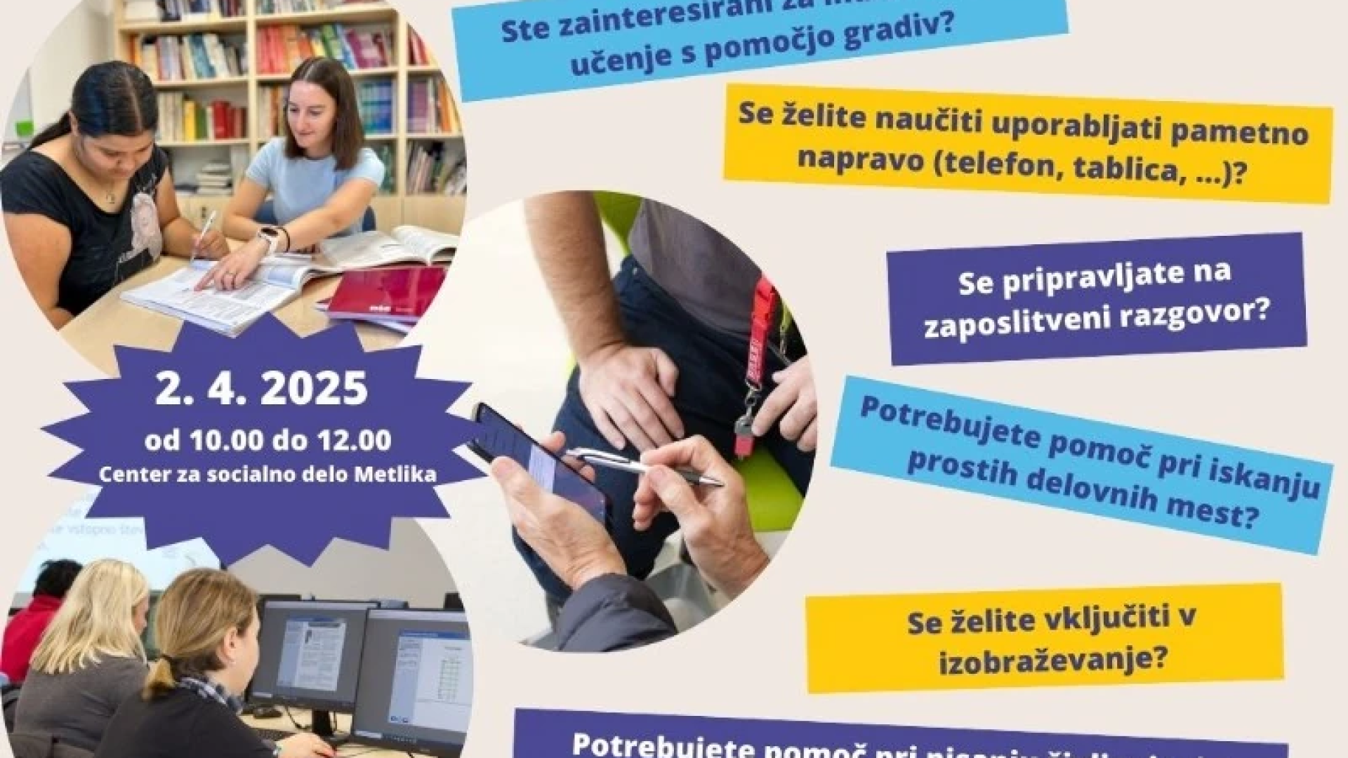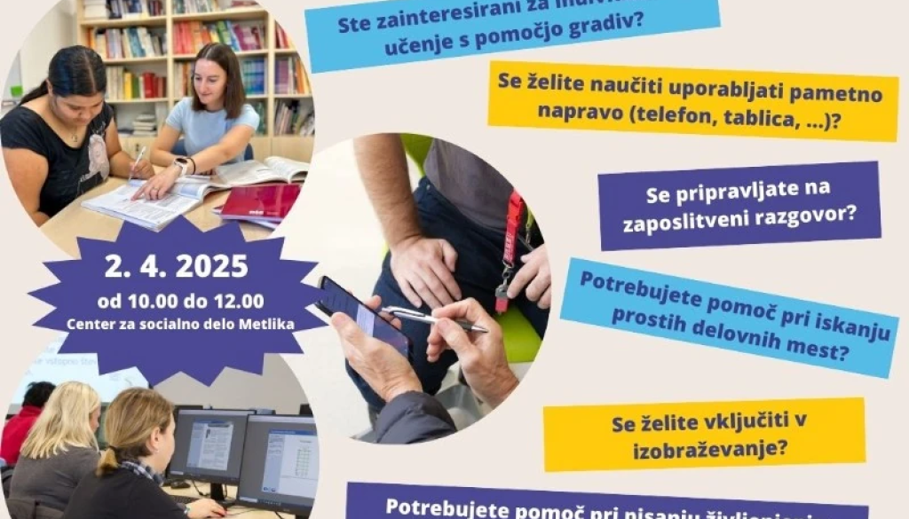 Center za socialno delo MetlikaZavod za izobraževanje in kulturo Črnomelj vas vabi na Center za socialno delo Dolenjska in Bela krajina enota Metlika, kjer bo v okviru svetovalne točke Svetovalnega središča Pokolpje potekalo informiranje in svetovanje o možnostih izobraževanja tako za zaposlene kot brezposelne osebe in upokojence. V okviru Središča za samostojno učenje se boste lahko, s pomočjo različnih učnih gradiv in ob strokovni pomoči svetovalke, samostojno učili in nadgradili svoja znanja s področja računalništva, tujih jezikov, pametnega telefona in drugih uporabnih znanj. V kolikor ste brezposelni, pa boste lahko pripravili svoj življenjepis in napisali vlogo za zaposlitev. Vabljeni na svetovalno točko v Metliko.