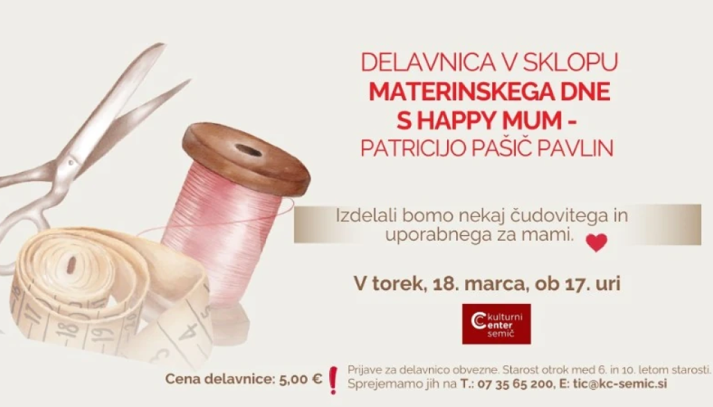 Kulturni center SemičKulturni center Semič vas ob 17. uri vabi v KC Semič na otroško delavnico v sklopu materinskega dne.