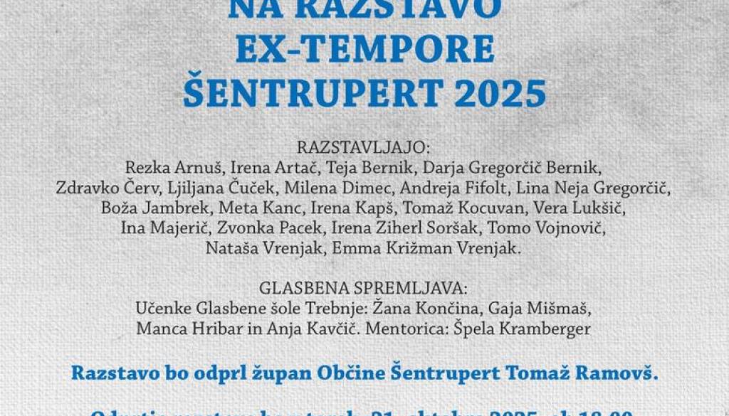 Odprtje razstave EX-TEMPORE ŠENTRUPERT 2025 gregor1 | 19. oktober 2025 11:01 v Kultura Termin Torek, 21. oktober 2025 18:00 Lokacija Dom kulture Šentrupert Odprtje razstave EX-TEMPORE ŠENTRUPERT 2025