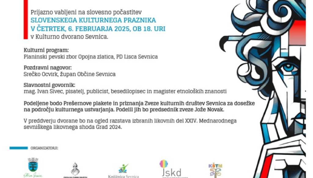 Kulturna dvorana SevnicaSlovesna počastitev kulturnega praznika s podelitvijo Prešernovih plaket in priznanj Zveze kulturnih društev Sevnica bo v četrtek, 6. februarja, ob 18. uri v Kulturni dvorani Sevnica. Priznanja na področju kulture bo podelil predsednik zveze Jože Novak. Zbrane bo pozdravil župan Srečko Ocvirk, osrednji gost in slavnostni govornik bo mag. Ivan Sivec, pisatelj, publicist, besedilopisec in magister etnoloških znanosti. Kulturni program bodo sooblikovali Planinski pevski zbor Opojna zlatica Planinskega društva Lisca Sevnica.