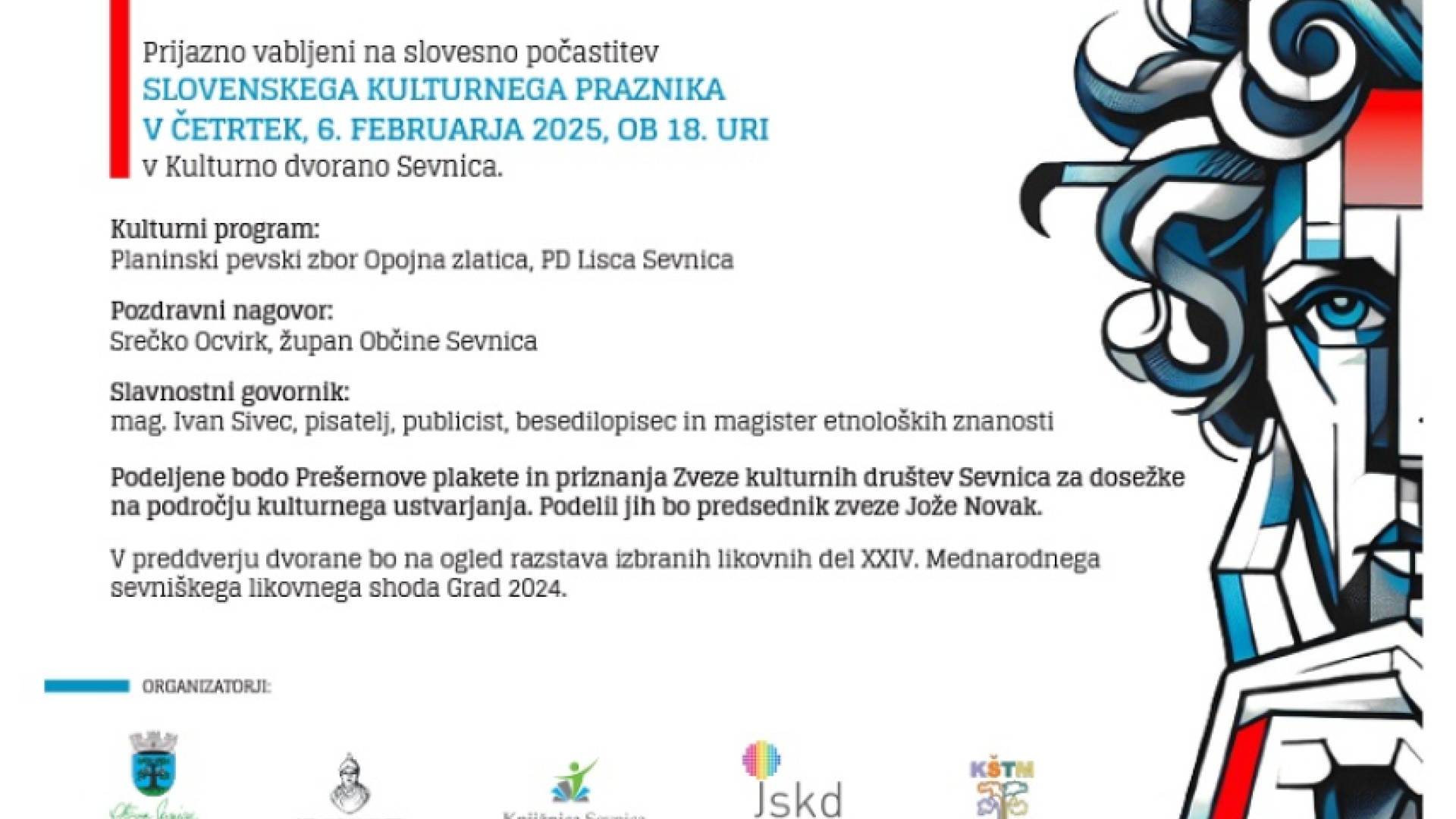 V preddverju dvorane bo na ogled razstava izbranih likovnih del XXIV. Mednarodnega sevniškega likovnega shoda Grad 2024. Osrednjo občinsko prireditev ob kulturnem prazniku organiziramo Občina Sevnica, ZVKD Sevnica, Knjižnica Sevnica, JSKD OI Sevnica in KŠTM Sevnica.