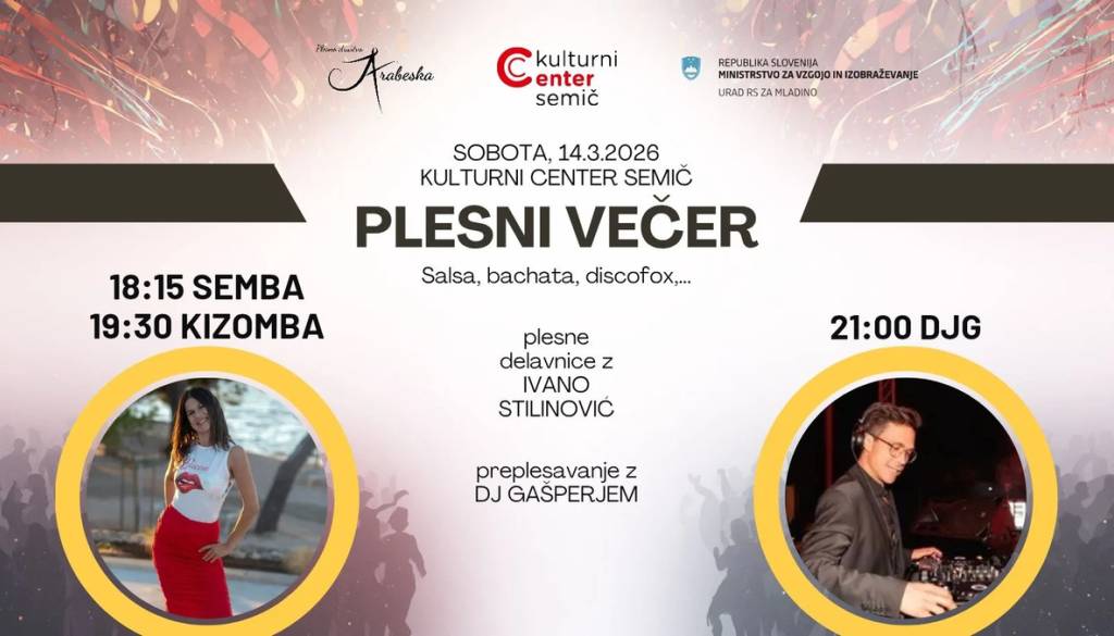 Kulturni center SemičPlesno društvo Arabeska in Kulturni center Semič vas vabita na PLESNI VEČER v soboto, 14. marca 2023, od 21. do 23. ure v Kulturni center Semič.