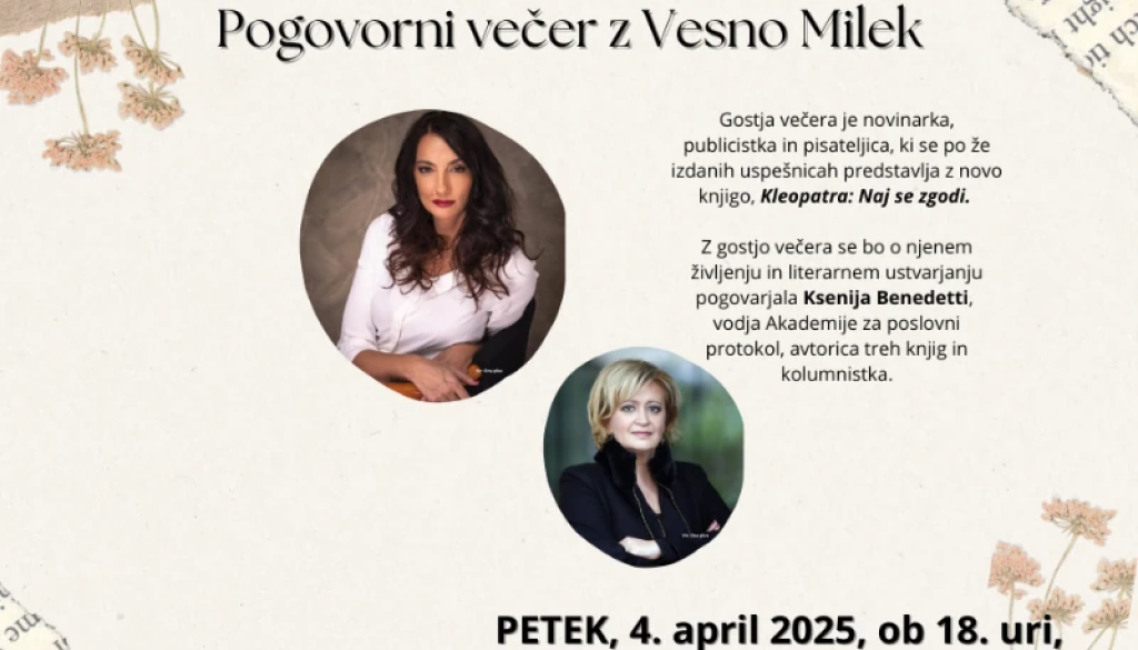 Knjižnica ČrnomeljGostja večera Vesna Milek je novinarka, publicistka in pisateljica, ki se po že izdanih uspešnicah predstavlja z novo knjigo, Kleopatra: Naj se zgodi. Z gostjo večera se bo o njenem življenju in literarnem ustvarjanju pogovarjala Ksenija Benedetti, vodja Akademije za poslovni protokol, avtorica treh knjig in kolumnistka. Lepo vabljeni na dogodek v Knjižnico Črnomelj, na katerem bo tudi možnost nakupa knjige.