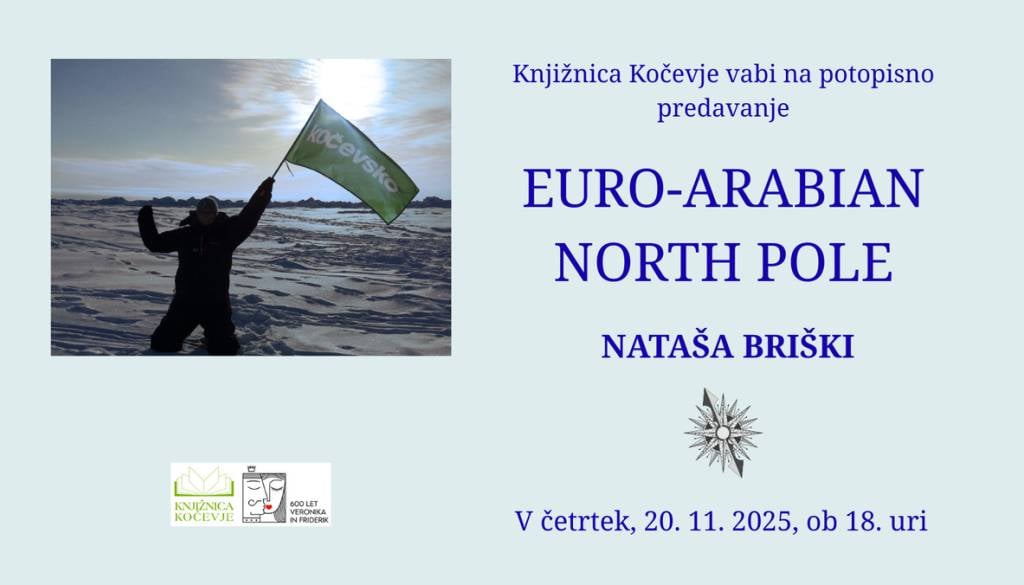 Knjižnica KočevjeKnjižnica Kočevje vabi na potopisno predavanje Nataše Briški z naslovom EURO-ARABIAN NORTH POLE, ki bo v četrtek, 20. novembra 2025, ob 18. uri.