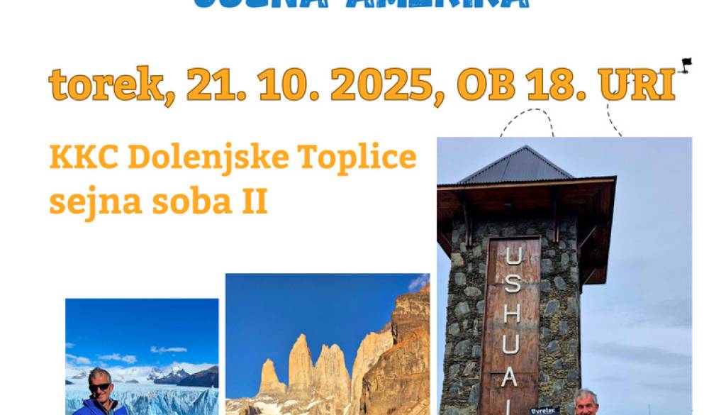 KKC Dolenjske TopliceVabljeni na potopisno predavanje o Patagoniji, ki bo v torek, 21. oktobra, v sejni sobi II v KKC Dolenjske Toplice ob 18. uri. Predavala vam bosta Brane Fabijan in Vladka Češek Bizjak.
