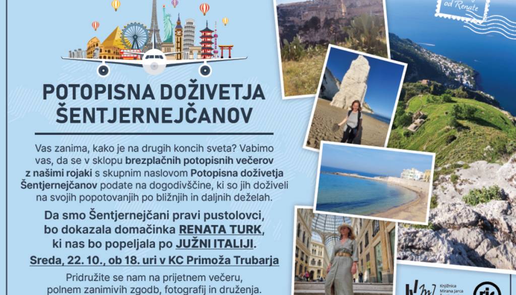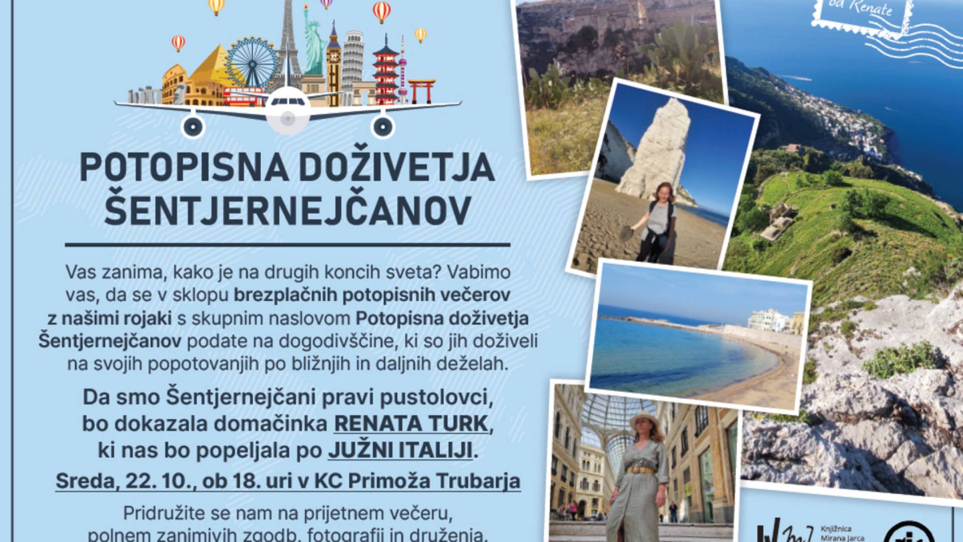 Vas zanima, kako je na drugih koncih sveta? Vabimo vas, da se v sklopu potopisnih večerov z našimi rojaki podate na dogodivščine, ki so jih doživeli na svojih popotovanjih po bližnjih in daljnih deželah. Da smo Šentjernejčani pravi pustolovci, bo dokazala domačinka Renata Turk, ki nas bo popeljala po južni Italiji. Pridružite se nam na prijetnem večeru, polnem zanimivih zgodb, fotografij in druženja. Vljudno vabljeni!