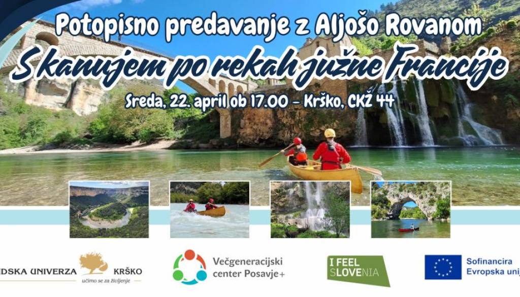 CKŽ 44, KrškoDružinska trojka kanuistov je dvajset pomladanskih dni preživela v južni Franciji. Udeležili so se mednarodnega kanuističnega festivala, veslali na petih rekah in dveh jezerih, raziskali dve zanimivi podzemski jami, občudovali slapove – in povsem nenadejano srečali tudi kozoroge! Na predavanju bo Aljoša Rovan s fotografijami in zgodbami in predstavil odpravo, ki združuje pustolovščino in ljubezen do divje narave.