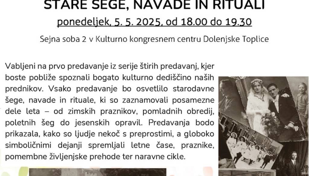 KKC Dolenjske TopliceVabljeni na predavanje z naslovom Stare šege, navade in rituali, ki bo v ponedeljek, 5. maja, ob 18. uri v KKC Dolenjske Toplice. Predaval bo Primož Primec. Predavanje bo izvedeno v sklopu projekta RIC Novo mesto Večgeneracijski center Skupaj+. Vstop je prost.