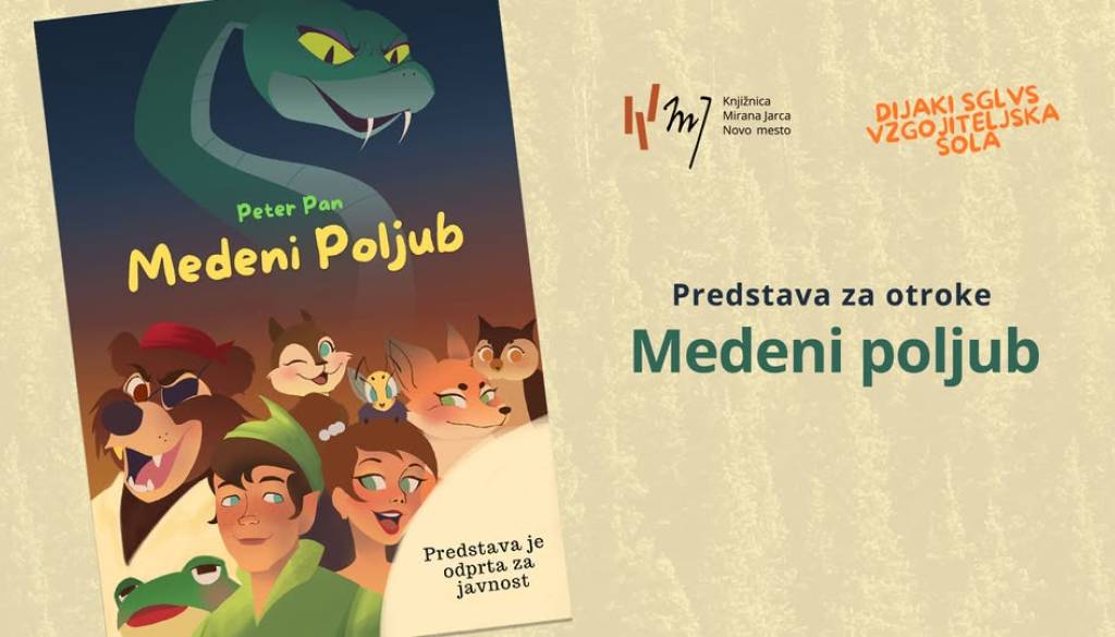 Knjižnica Mirana Jarca Novo mestoOtroci, prijazno vabljeni k ogledu predstave Medeni poljub v izvedbi dijakinj in dijakov 4. letnika predšolske vzgoje Srednje gradbene, lesarske in vzgojiteljske šole.
