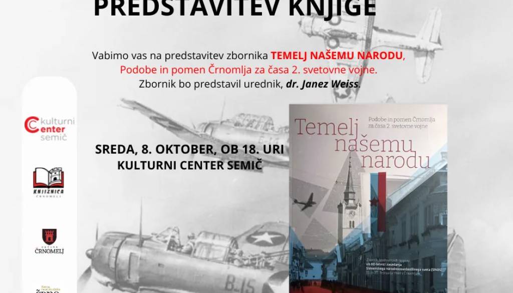 Kulturni center SemičKulturni center Semič in Knjižnica Črnomelj vas v sklopu Tematskih večerov v Muzejski hiši Semič vabita na predstavitev zbornika TEMELJ NAŠEMU NARODU, Podobe in pomen Črnomlja za časa 2. svetovne vojne avtorja dr. Janeza Weissa v sredo, 8. oktobra 2025, ob 18. uri v Kulturnem centru Semič.
