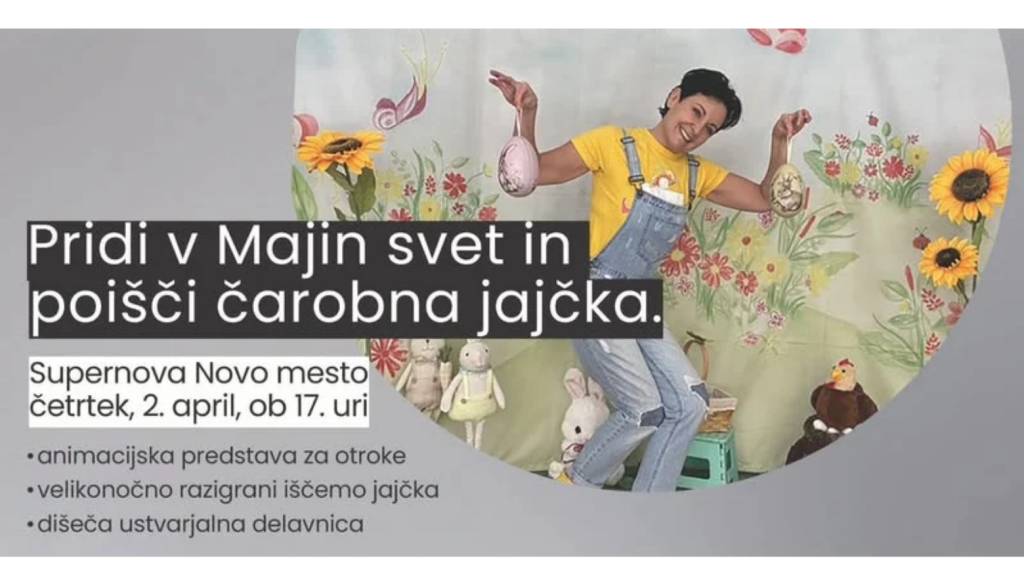 Supernova Novo MestoSupernova Novo mesto vabi na animacijsko predstavo za otroke Pridi v Majin svet in poišči čarobna jajčka, ki bo v četrtek, 2. 4. 2025, ob 17. uri.