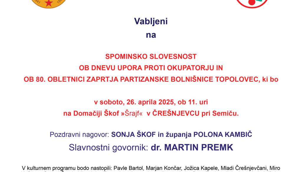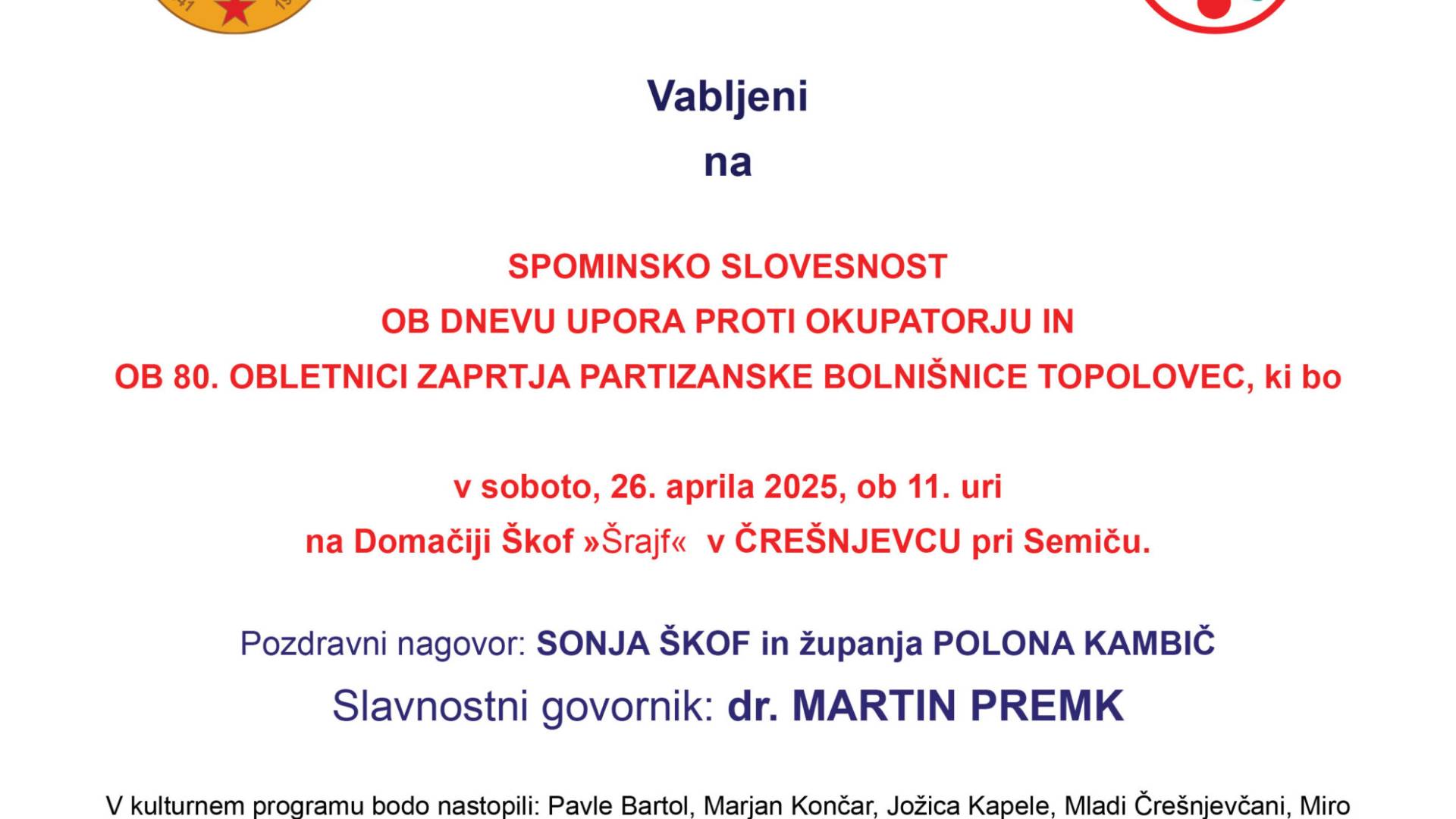 Domačija Škof ŠrajfZB za vrednote NOB Semič, Domačija Škof, Šrajf in Občina Semič vas vabijo na PRIREDITEV OB PRAZNIKU DAN UPORA PROTI OKUPATORJU, 80 LET ZAPRTJA BOLNIŠNICE TOPOLOVEC in 10. OBLETNICA MUZEJSKE ZBIRKE BOLNIŠNICE TOPOLOVEC v soboto, 26. aprila, ob 11. uri v Črešnjevcu – Domačiji Škof Šrajf.