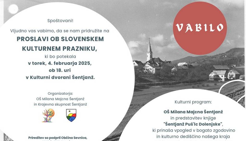 Kulturna dvorana ŠentjanžUvod v praznovanja kulturnega praznika v sevniški občini bodo s proslavo in predstavitvijo nove publikacije o kraju obeležili v Šentjanžu v torek, 4. februarja, ob 18. uri v Kulturni dvorani Šentjanž.