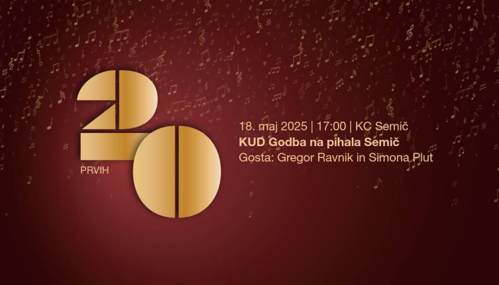 KC SemičKUD Godba na pihala Semič vas vabi na koncert ob 20. obletnici delovanja “PRVIH DVAJSET” v nedeljo, 18. maja 2025, ob 17. uri v Kulturnem centru Semič.