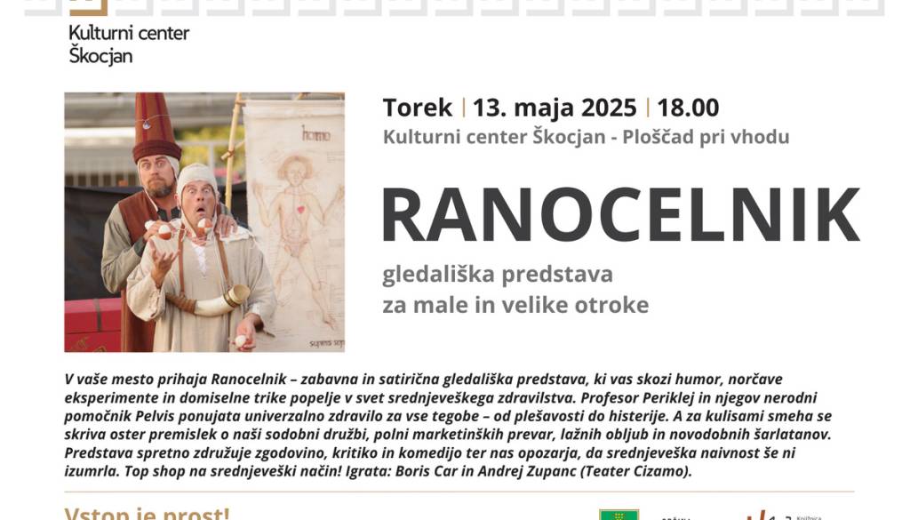 V vaše mesto prihaja Ranocelnik – zabavna in satirična gledališka predstava, ki vas s humorjem, norčavimi eksperimenti in domiselnimi triki popelje v svet srednjeveškega zdravilstva.
